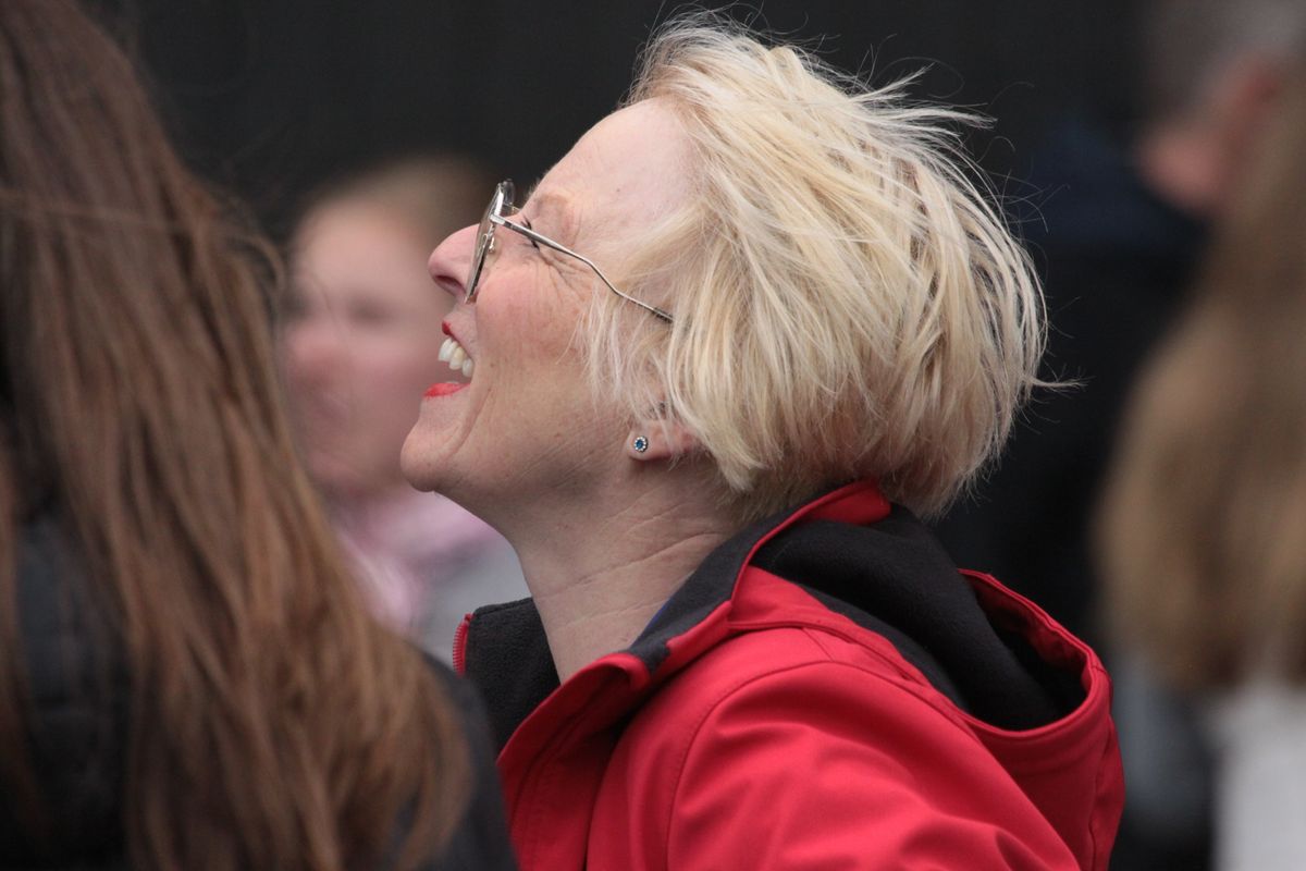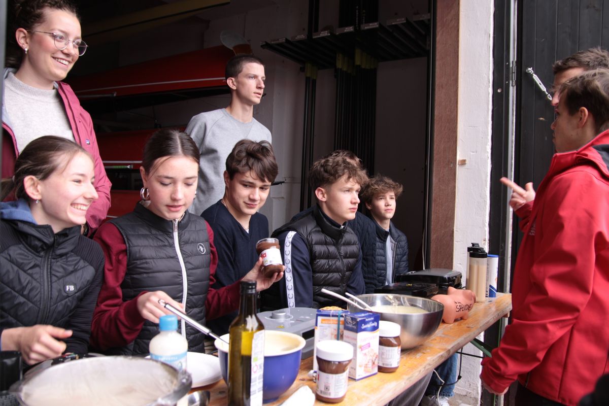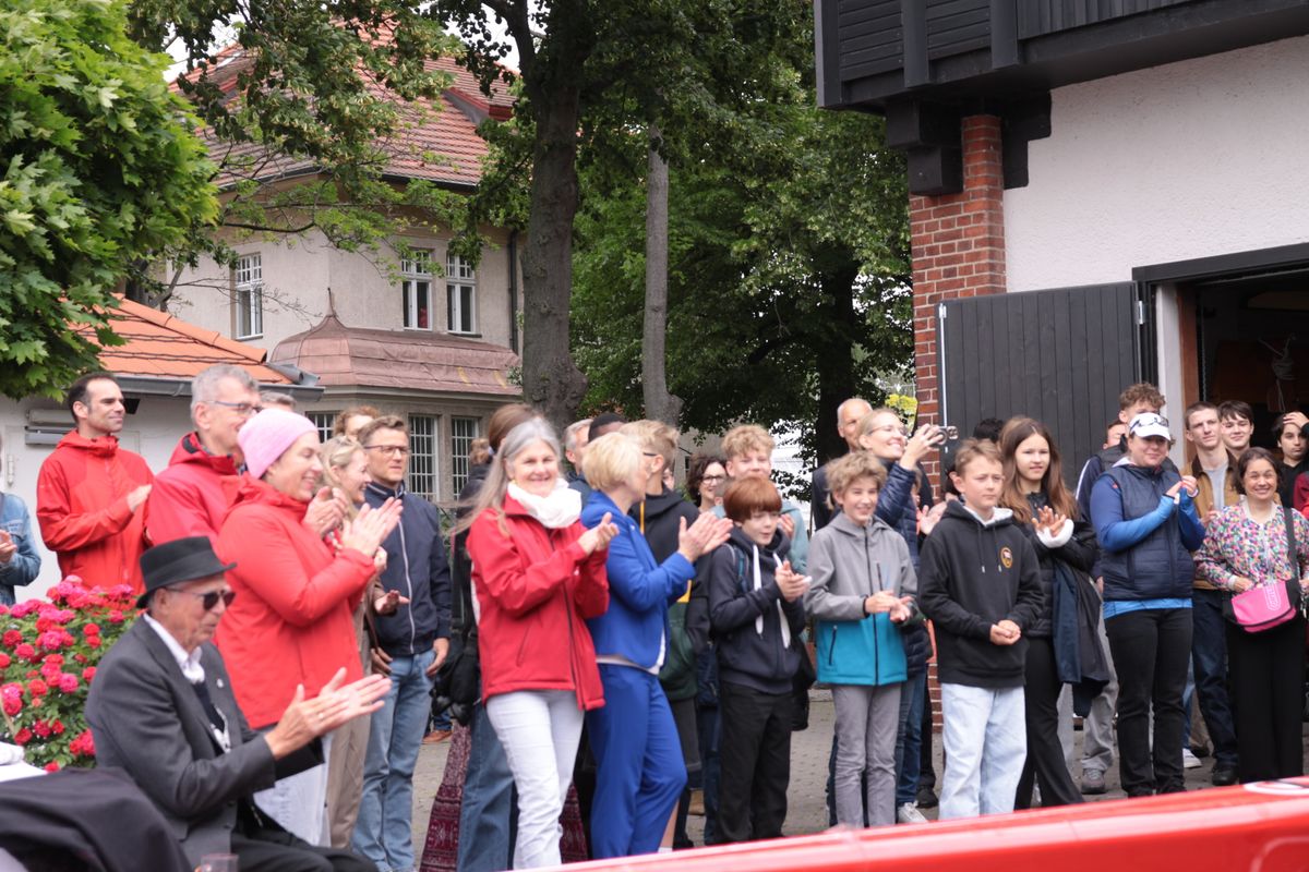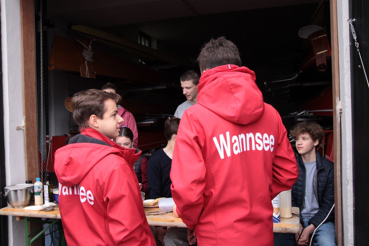 Dank dieses nicht ganz so freundlichen Wetters haben wir nun ein Bild, auf dem zu erkennen ist, dass der Bootsplatz zusätzlich zu den rot-weißen Schleifen auch mit Menschen in Vereinsfarben rot- weiß geschmückt ist.