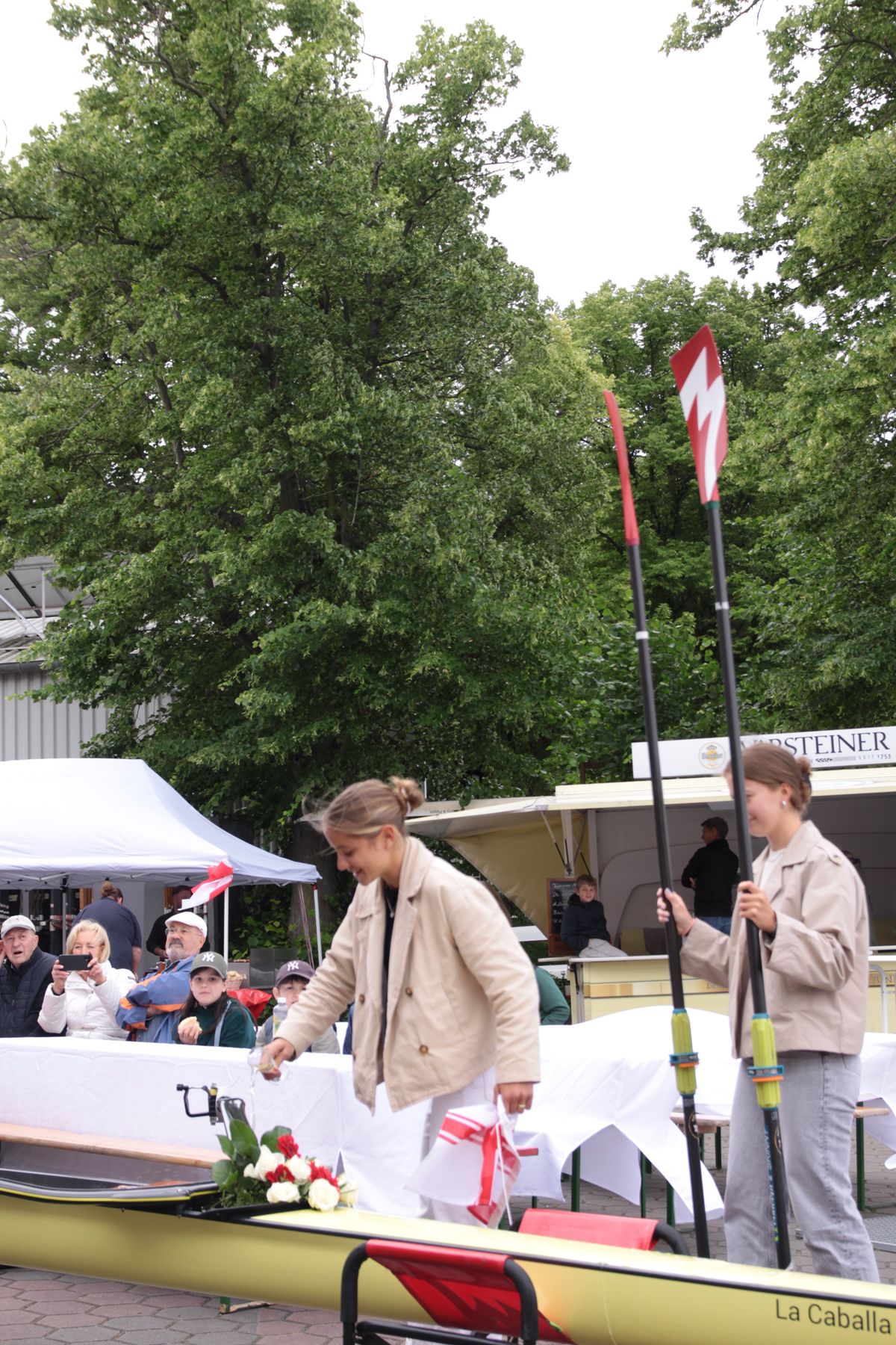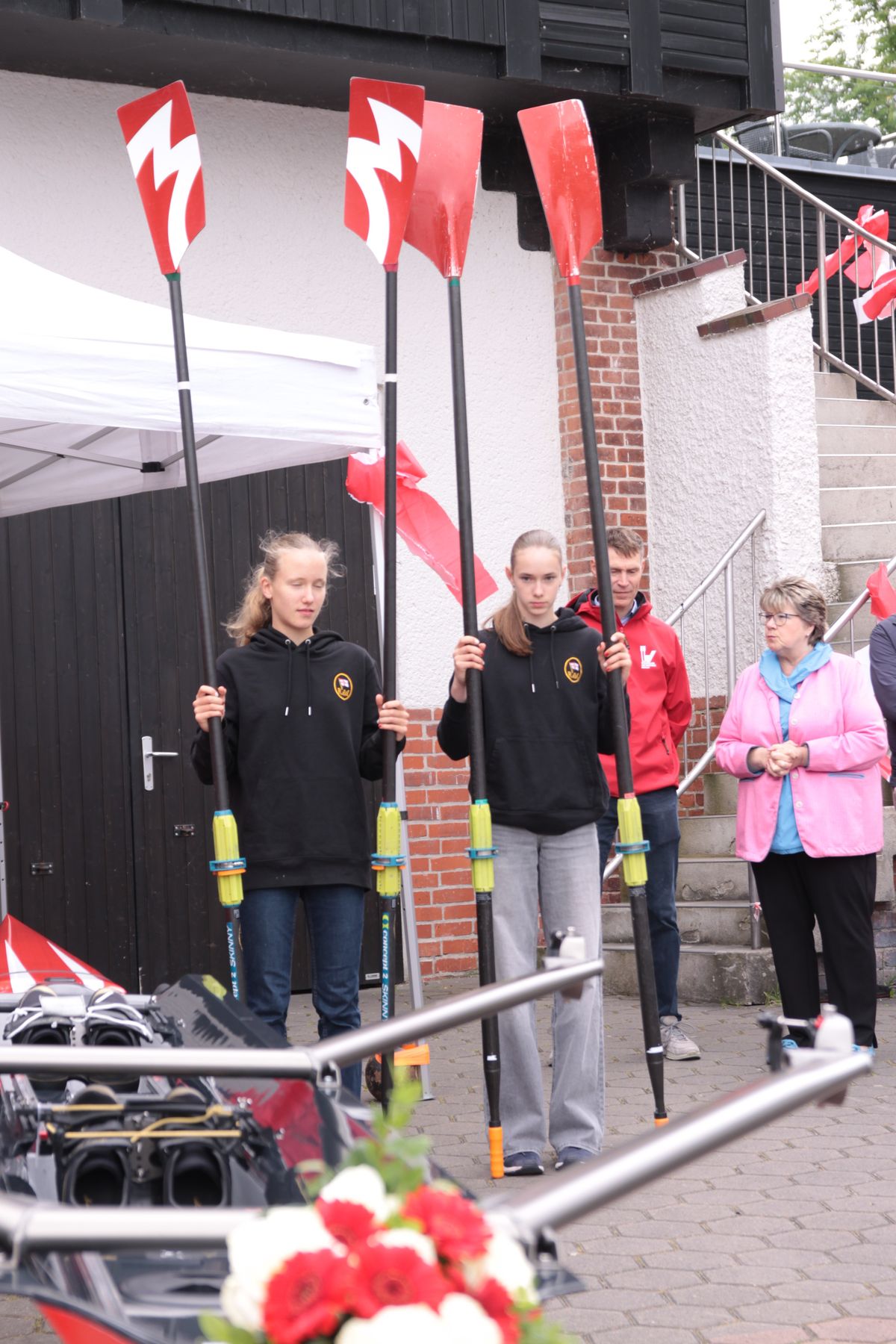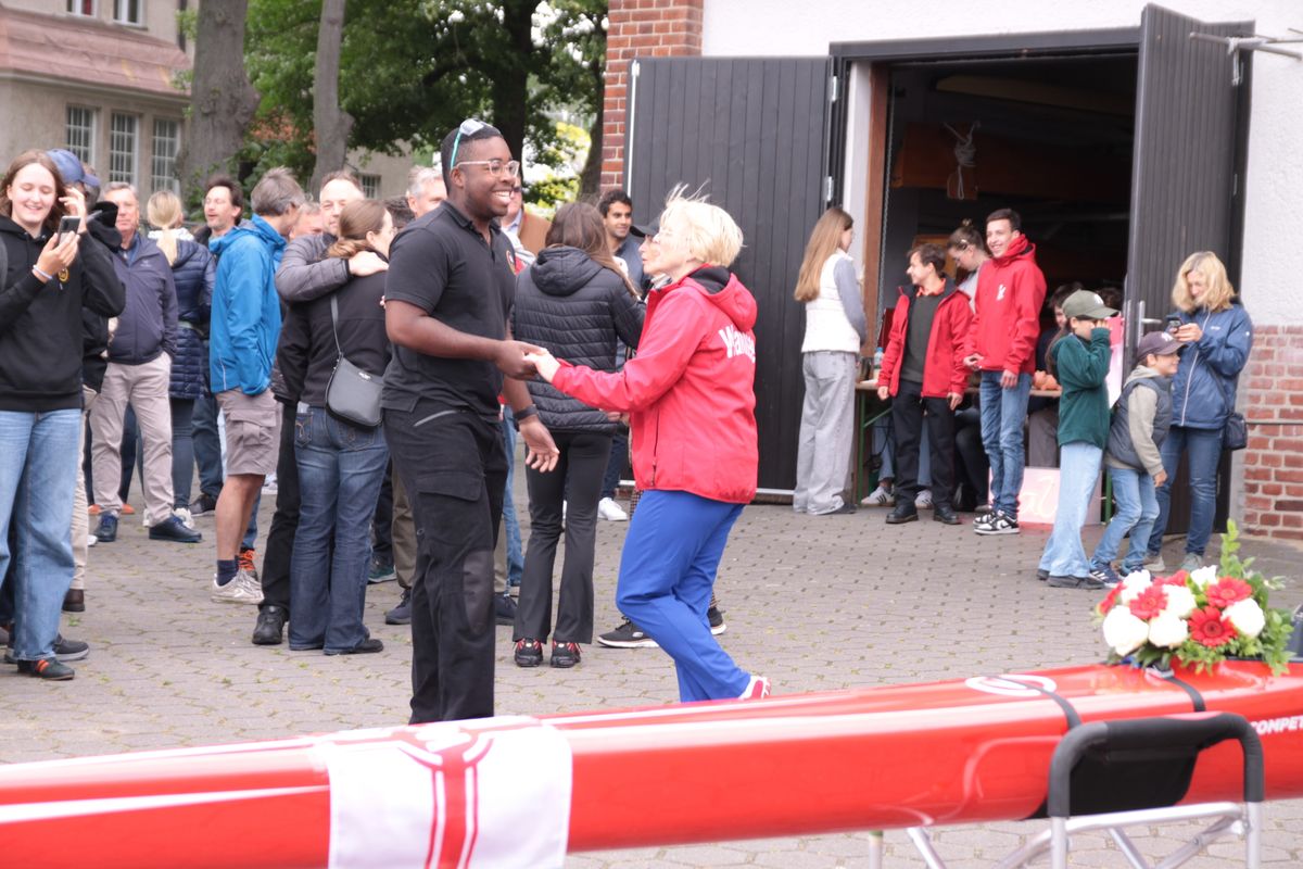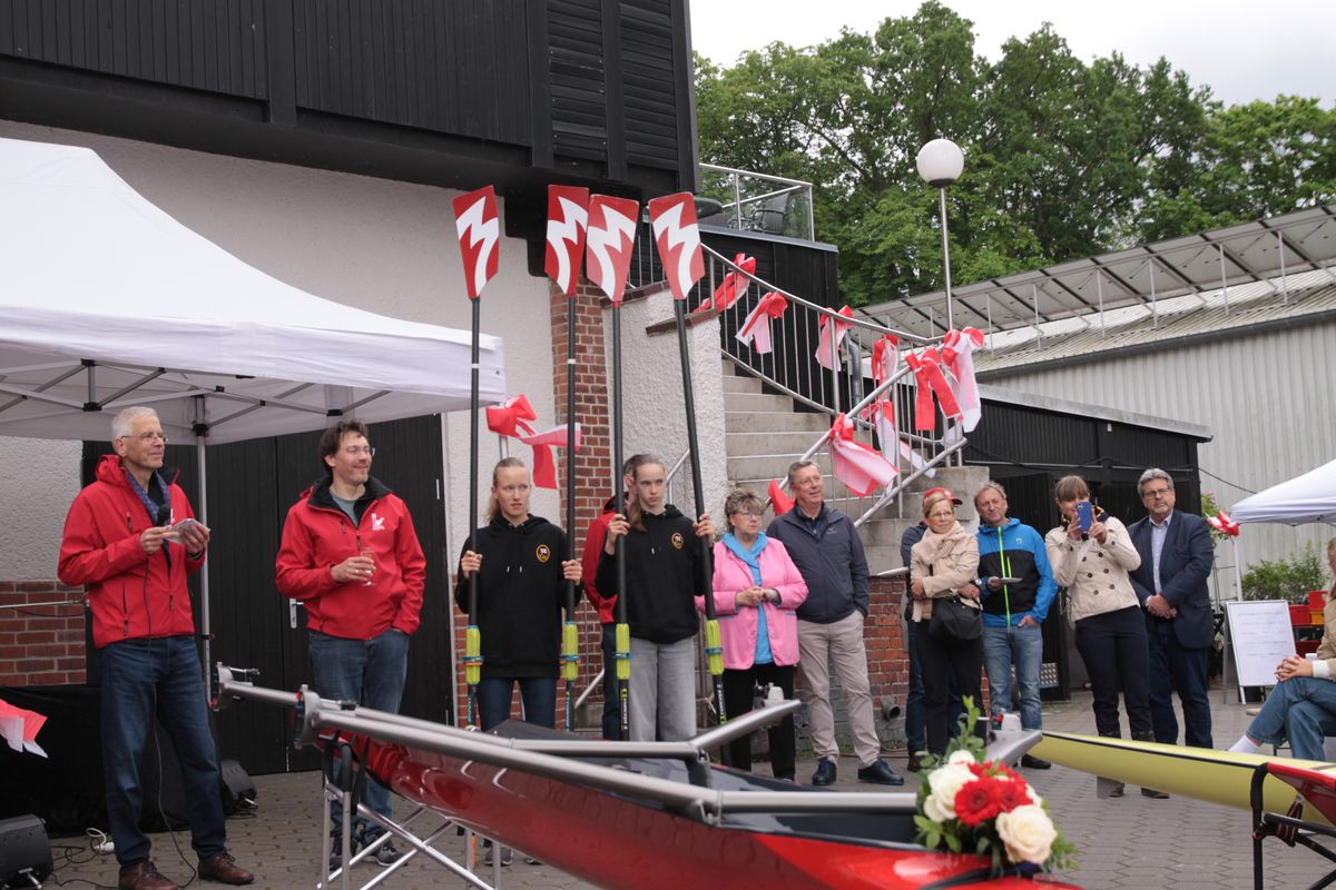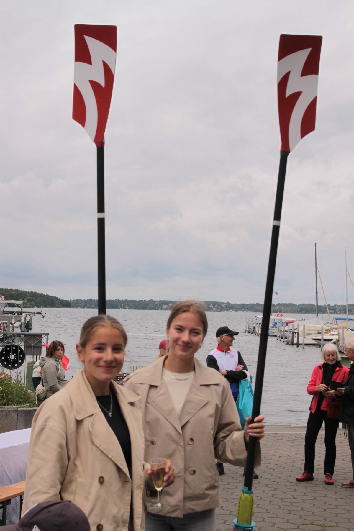 Zwei Boote wurden getauft. Das doppelte Lottchen und la Cavella. Beide sind für unsere Hoffnungsträger, die Jugend, zu der ich jetzt einfach einmal den Leistungssport dazu zähle, bestimmt. Und beide erworben dank großzügiger Zuschüsse. Dafür konnte unser Vorstandsvorsitzender, Jörn Janicke sich bei seinen Ehrengästen, Frau Götze vom Bezirksamt Zehlendorf und Karsten Finger als Vorsitzender einer Stiftung, deren Name so lang ist, dass Jörn ihn vom Blatt ablesen musste, bedanken. Danke. Noch einmal. Ohne Spenden und Zuschüsse ist Jugendarbeit nicht möglich.